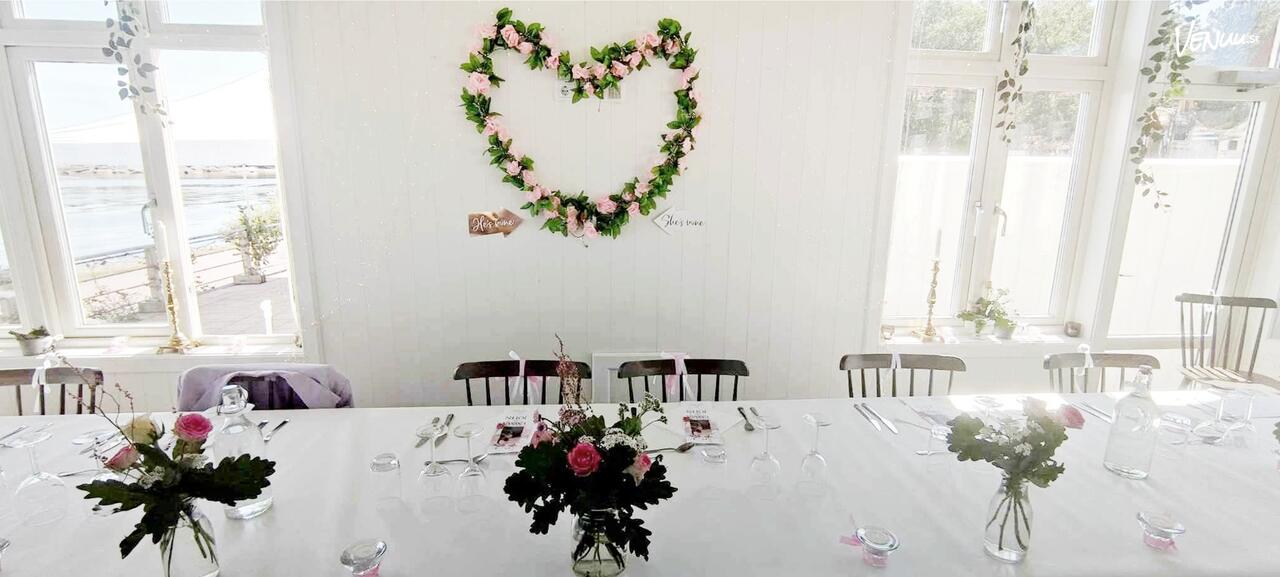 Här kan du hålla en vigsel utomhus med sjön som kuliss och sedan bjuda dina gäster på en middag i deras ljusa restaurang. Vill du ha en grillfest under stjärnorna eller dansa på bryggan?